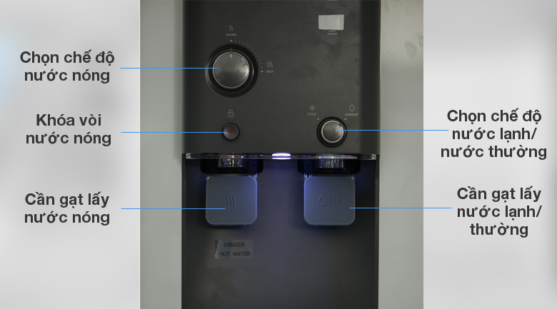 Các vòi lấy nước kiểu cần gạt được thiết kế tinh tế hiện đại và rất tiện dụng khi thao tác lấy nước uống. Máy được trang bị đèn cảm biến ánh sáng, giúp người dùng thuận tiện lấy nước vào ban đêm.
