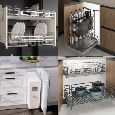 Chẳng hạn, chiếc tủ bếp với hình khối đơn giản, tích hợp nhiều phụ kiện thông minh sẽ là lựa chọn hoàn hảo cho căn bếp hiện đại. Các thiết bị phụ kiện như: giá để xoong nồi, giá nâng hạ bát đĩa, kệ đựng gia vị, thùng đựng gạo thông minh,… được lắp đặt âm tủ không chỉ giúp tối ưu diện tích bếp mà còn góp phần nâng tầm đẳng cấp cho không gian.